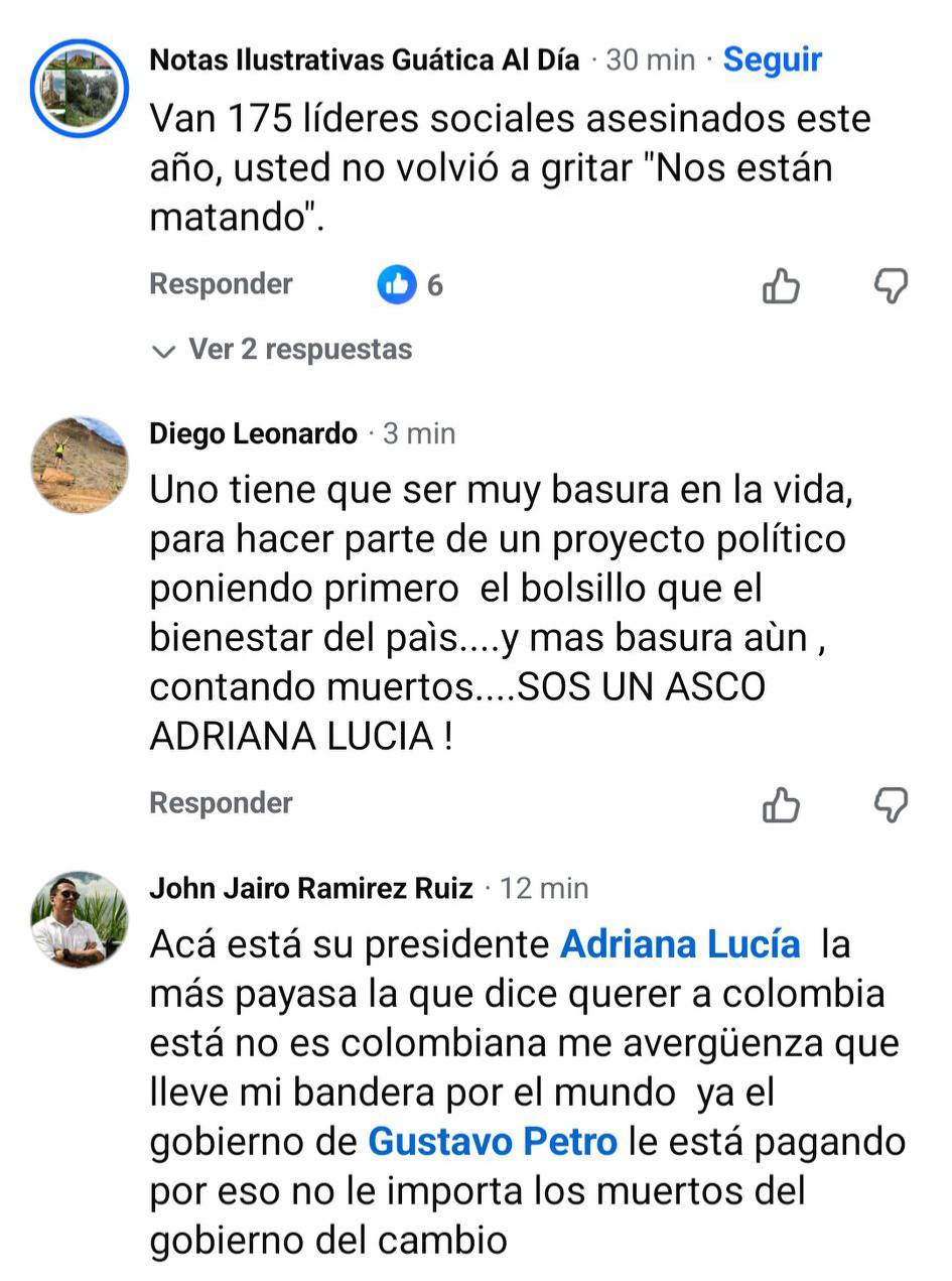 Otros fueron aún más duros, acusándola de “abandonar sus causas” y de estar “del lado del poder”, “Sos un asco, Adriana Lucía”, escribió un usuario en evidente tono de furia. Otro la llamó “payasa” y dijo sentirse avergonzado de verla como representante del país.