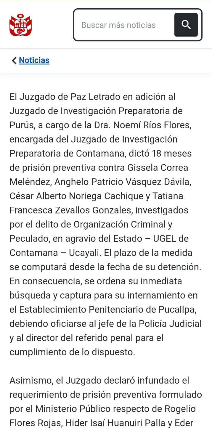El Juzgado de Paz Letrado, en adición al Juzgado de Investigación Preparatoria de Purús y a cargo de la Dra. Noemí Ríos Flores, dictó 18 meses de prisión preventiva contra Gissela Correa Meléndez, Anghelo Patricio Vásquez Dávila, César Alberto Noriega Cachique y Tatiana Francesca Zevallos Gonzales.