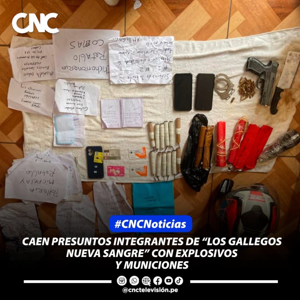 #Nacional || La Policía Nacional del Perú (PNP) detuvo en Lima Norte a dos presuntos integrantes de la banda “Los Gallegos Nueva Sangre”, implicados en extorsión y porte de armas y explosivos. Durante el operativo, se incautaron 17 explosivos artesanales, 2 cartuchos de dinamita, 53 municiones, celulares, chips telefónicos, un grillete, una tarjeta bancaria y panfletos extorsivos. Los detenidos, Kaherine Fresia Jamanca Obregón, alias “María”, y Jem Daisako Rojas Ore, alias “Bebé”, quedaron a disposición de las autoridades para las diligencias correspondientes.