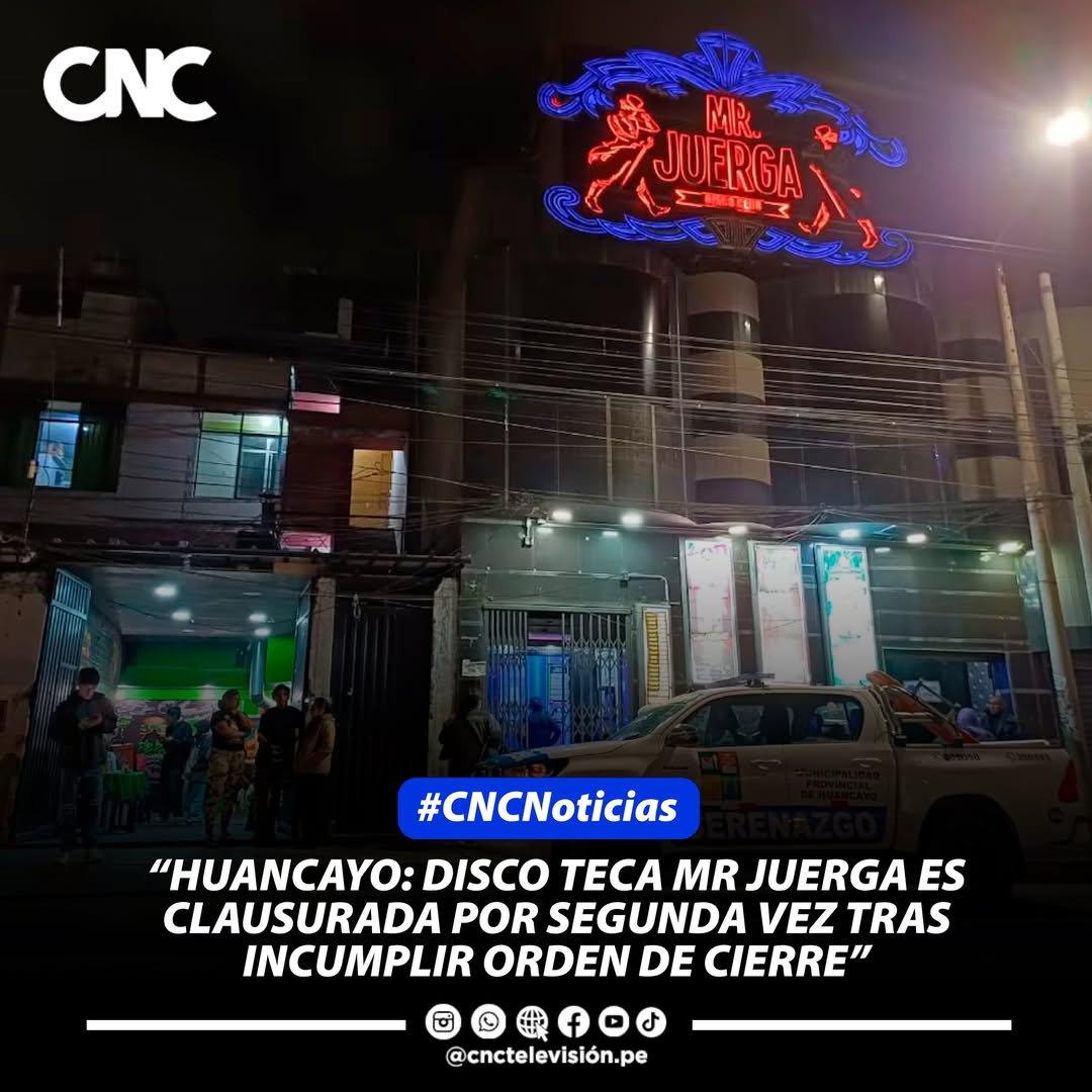 La discoteca Mr Juerga, ubicada en el Jr. Ayacucho 773 en Huancayo, fue clausurada por segunda vez tras comprobarse que seguía operando pese a tener una orden de cierre vigente desde hace 20 días dictada por la Municipalidad Provincial de Huancayo por incumplir normas municipales y de seguridad.