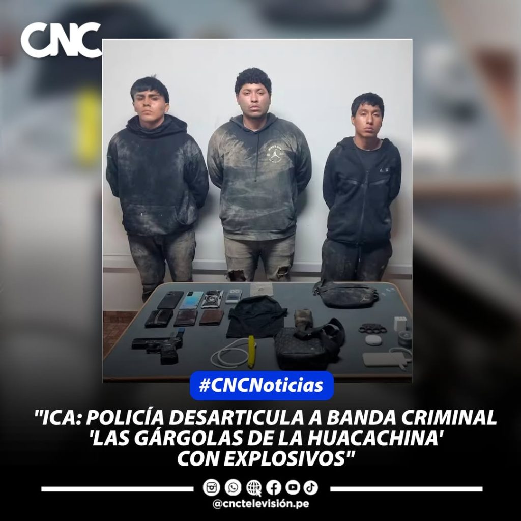 En un operativo realizado durante la madrugada en la provincia de Ica, la Policía Nacional del Perú logró desarticular a la presunta banda delictiva «Las gárgolas de la Huacachina». La intervención tuvo lugar en la avenida Huacachina, donde los agentes detuvieron a tres sujetos en actitud sospechosa: Francis Arom Ormeño Donayre (20), Rolando Uria Cuba (19) y el ciudadano venezolano Jamir Hernández Arena (21). A los detenidos se les incautó un cartucho de explosivo industrial con mecha fulminante, una réplica de arma de fuego y pasamontañas, elementos que presuntamente utilizaban para sus actividades ilícitas.