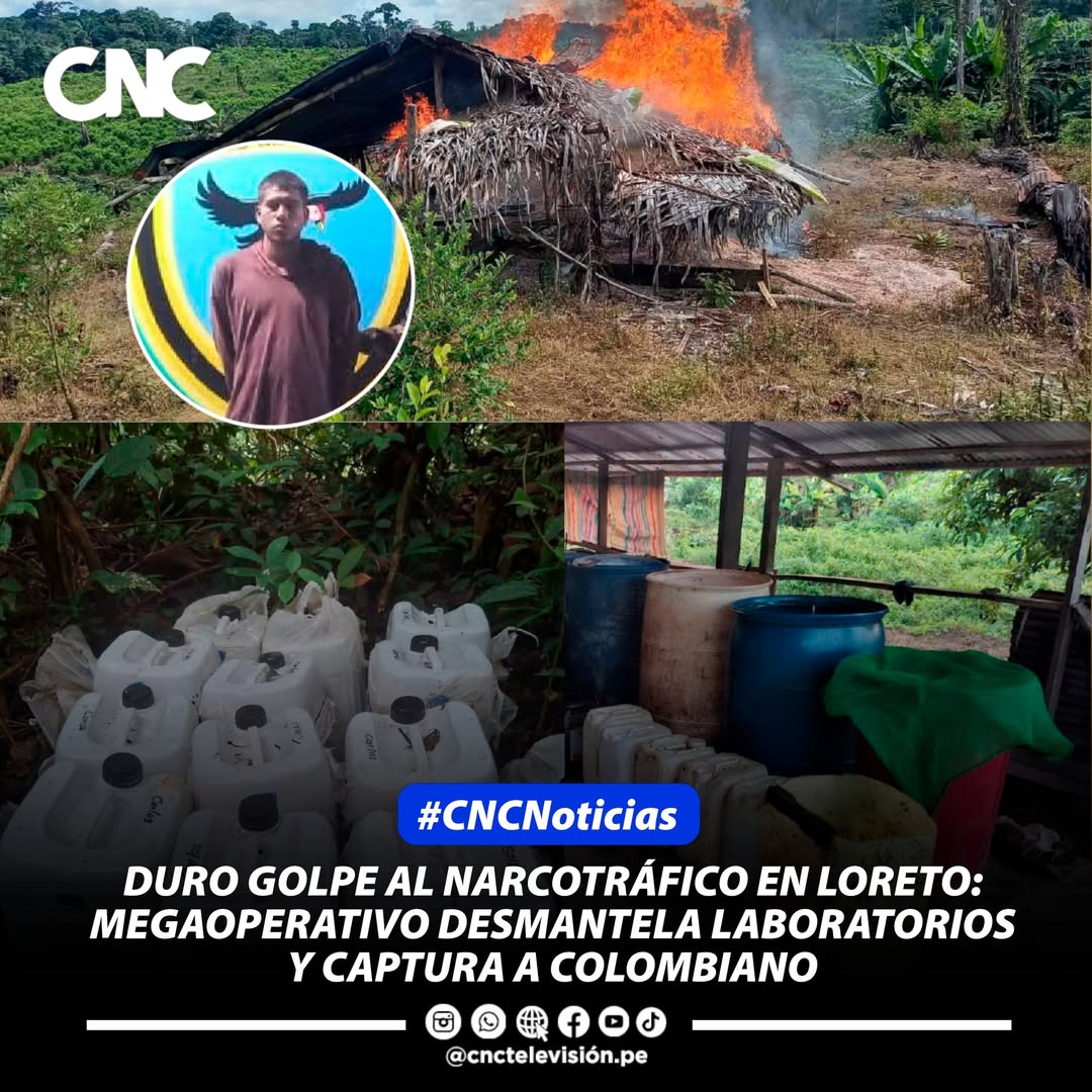 #Noticias || En un operativo conjunto que marca uno de los golpes más contundentes recientes contra el narcotráfico en Loreto, agentes de la Dirección Antidrogas de la Policía Nacional (DIRANDRO) y efectivos del Ejército Peruano, bajo la conducción de la Fiscalía Especializada en Tráfico Ilícito de Drogas de Iquitos, desmantelaron un mega campamento y un laboratorio de procesamiento de drogas en la comunidad nativa El Platanal, en el distrito de Ramón Castilla. La intervención, realizada entre el 24 y 25 de noviembre de 2025, culminó con la captura del ciudadano colombiano Jeison Augusto Falcon Chita, alias “Mono”, de 23 años, quien operaba en la zona.