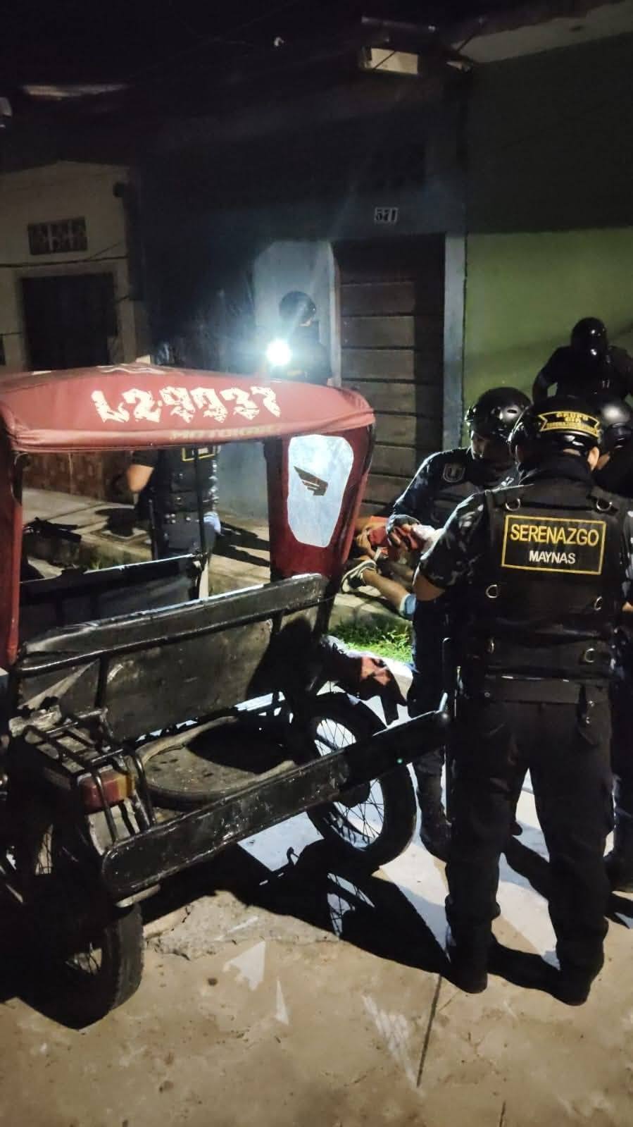 ​Dos sujetos identificados como Luis Talaxio Chilicahua (31) y Pedro Pacaya Shapiama (41) fueron detenidos en la madrugada de hoy en Iquitos, luego de ser intervenidos a bordo de un motocarro sospechoso en la intersección de las calles San Antonio con Castañas. La rápida acción fue ejecutada por personal del Serenazgo de Maynas, quienes hallaron en el vehículo carteras y documentos que confirmaron un hurto agravado cometido minutos antes en el distrito de Punchana.