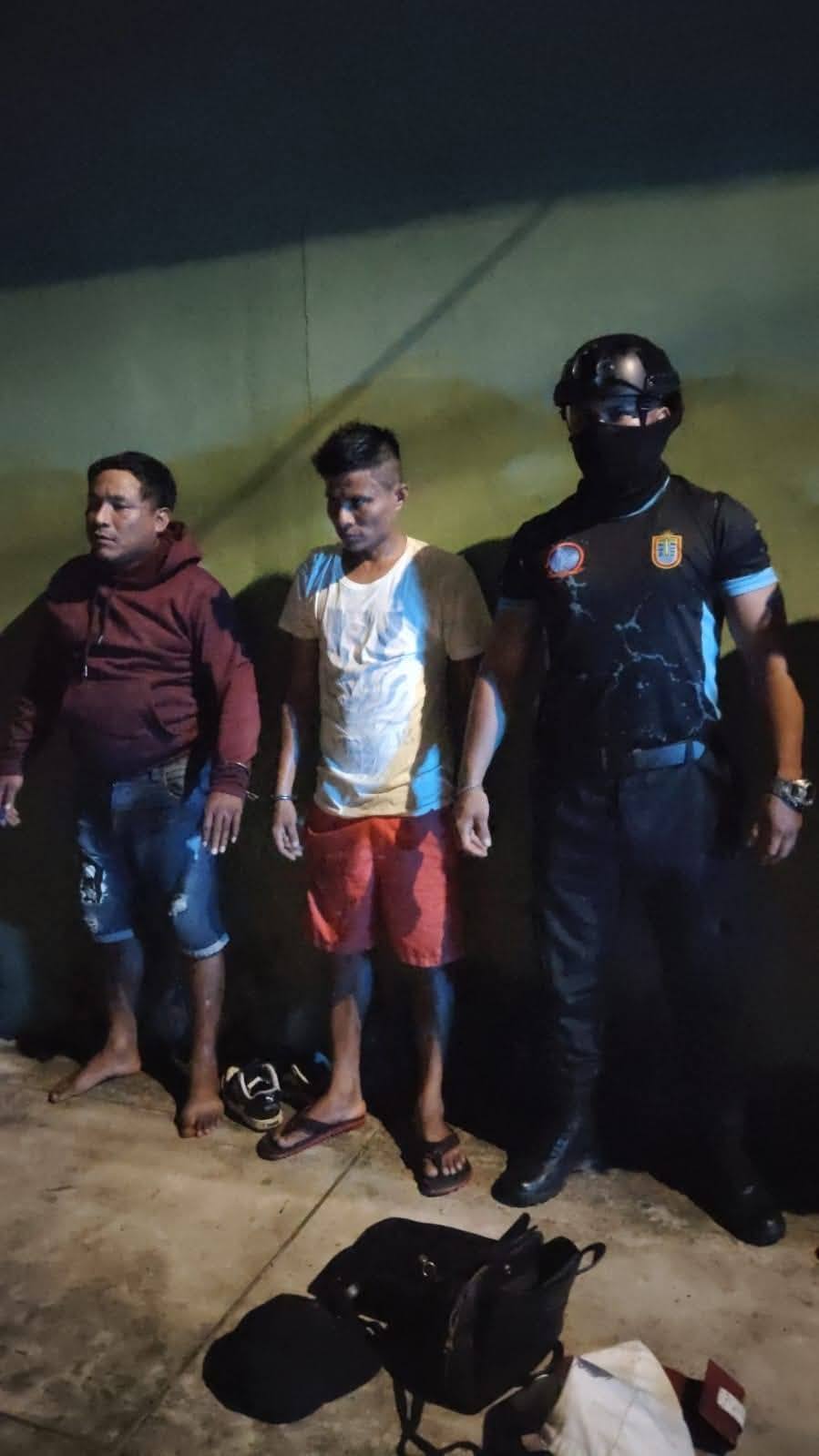 ​Dos sujetos identificados como Luis Talaxio Chilicahua (31) y Pedro Pacaya Shapiama (41) fueron detenidos en la madrugada de hoy en Iquitos, luego de ser intervenidos a bordo de un motocarro sospechoso en la intersección de las calles San Antonio con Castañas. La rápida acción fue ejecutada por personal del Serenazgo de Maynas, quienes hallaron en el vehículo carteras y documentos que confirmaron un hurto agravado cometido minutos antes en el distrito de Punchana.