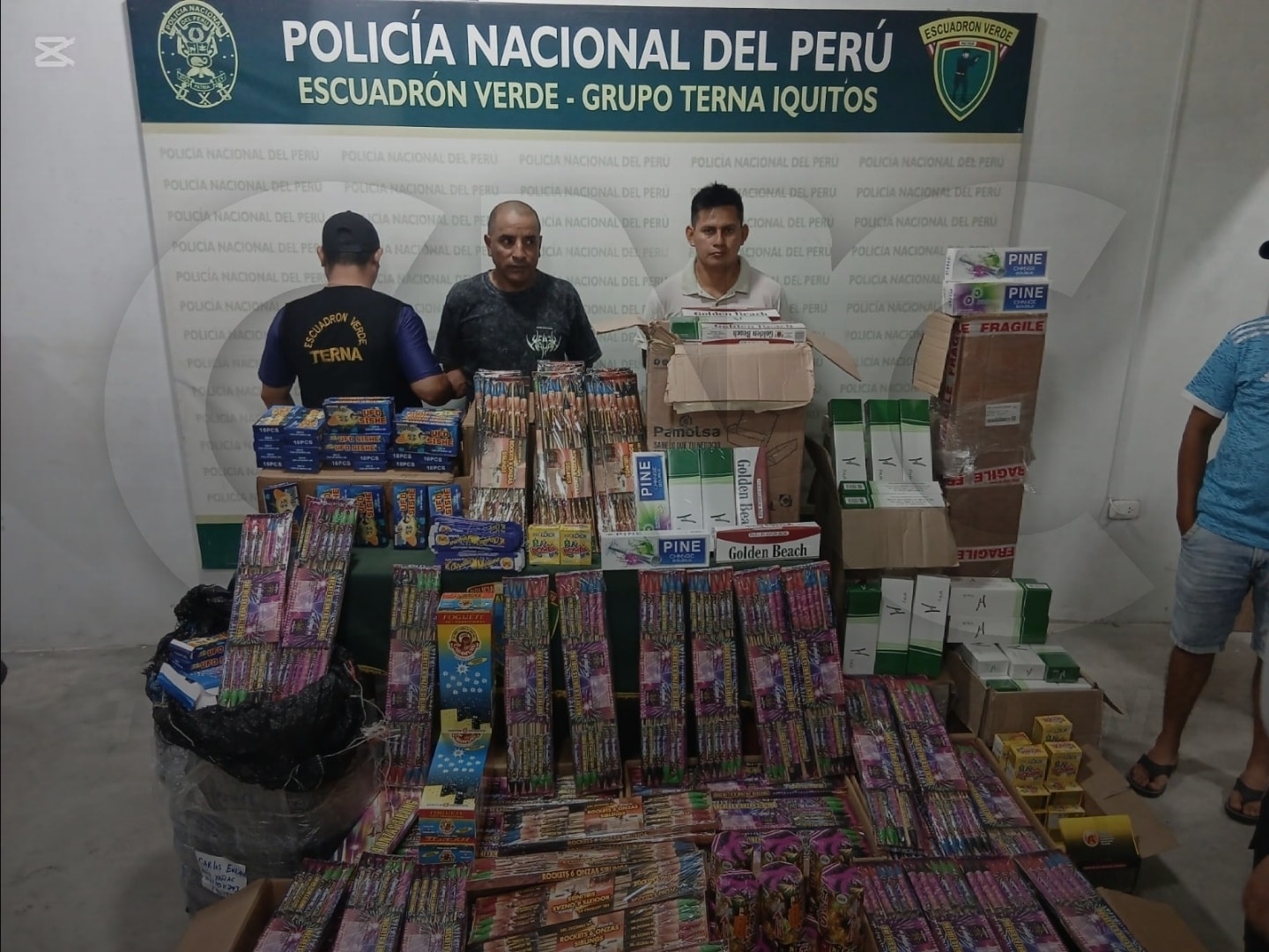 Agentes del Escuadrón Verde de Loreto desarticularon anoche la banda criminal “Los Intocables de la Pirotecnia Iquitos”, dedicada al acopio y distribución ilegal de artefactos pirotécnicos y contrabando. La intervención se realizó en el distrito de Punchana, culminando con la detención de Víctor Manuel Solano Pacaya (36), alias «Yuca», y Roberto Rosadio Tapia (51), alias «Negro Martín». Ambos son investigados por Delitos Aduaneros. En el lugar, la policía incautó 3,759 unidades de pirotecnia de alto riesgo y 52,800 unidades de cigarrillos extranjeros sin documentación.