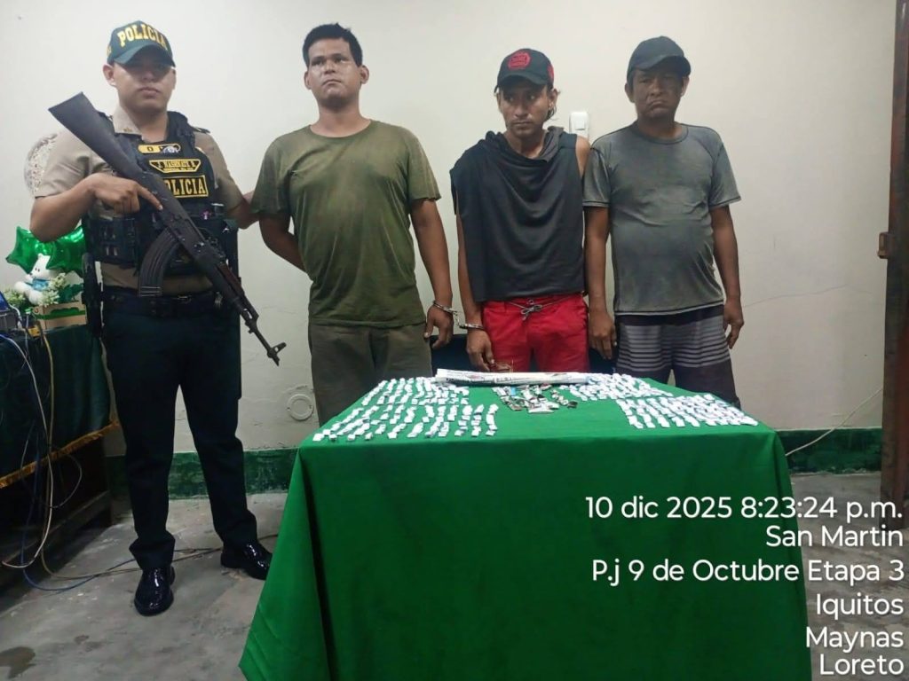 Una operación conjunta entre el Serenazgo de Maynas y agentes de la Comisaría 9 de Octubre, actuando sobre información de inteligencia, desarticuló a la presunta banda criminal “Los Anónimos”, dedicada al tráfico ilícito de dr0gas en Iquitos. La intervención se llevó a cabo en una vivienda ubicada en la calle El Aguaje N° 68 del A.H. Pampa Chica. Durante el operativo fueron detenidos tres sujetos: Edward Junior Gil Moena (32), alias “Zancudo”; Julio César del Águila Lavinto (41), alias “Dudu”; y Ángel Eduardo Tangoa Nolorbe (22), alias “Guffi”.