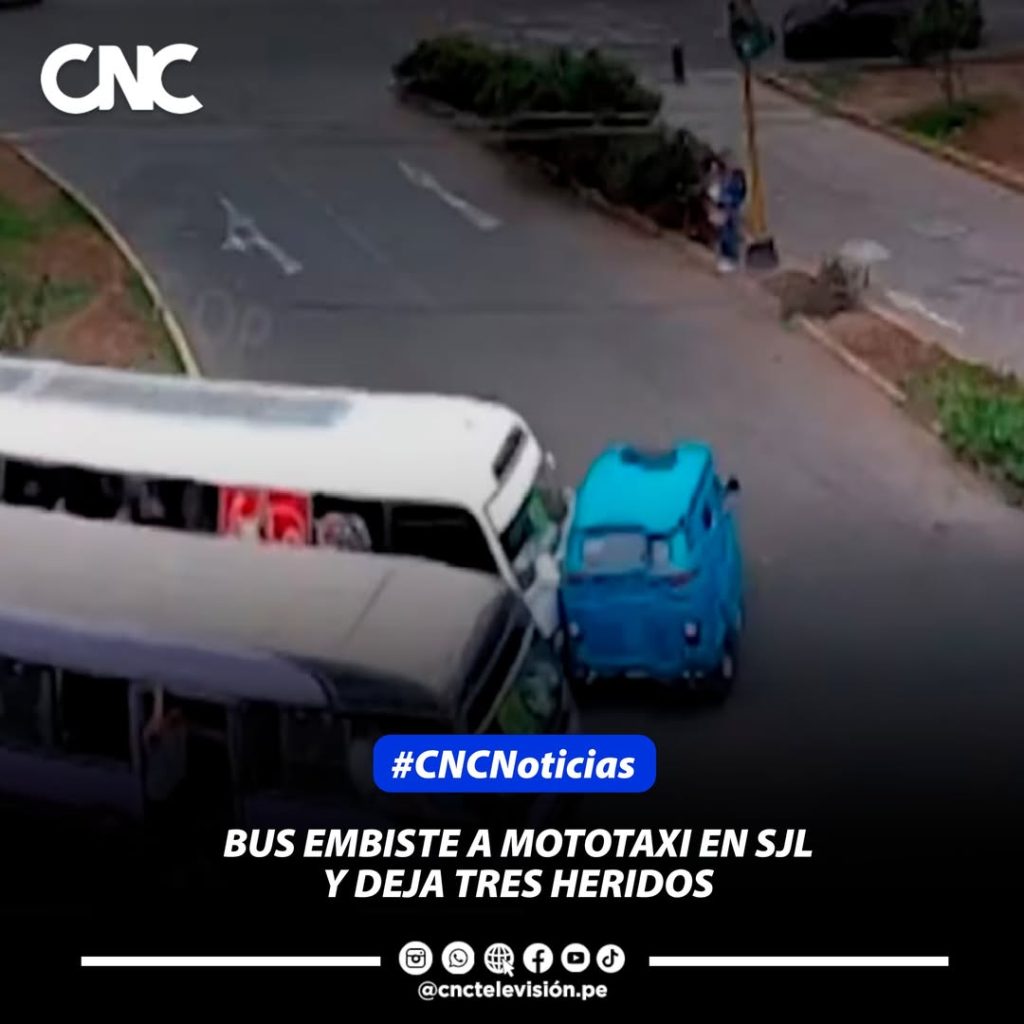 #Noticias || #lima || Un mototaxi fue embestido por un bus de transporte público en el distrito de San Juan de Lurigancho, dejando tres personas heridas. El accidente ocurrió la mañana de este martes, alrededor de las 11:00 a. m., en el cruce de las avenidas Próceres de la Independencia y San Hilarión Oeste.