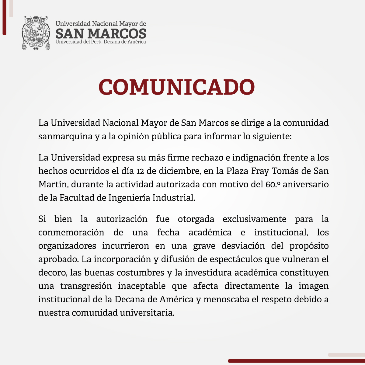 #Noticias #lima || Un video difundido en redes sociales que muestra un show de strippers durante una fiesta universitaria en la Universidad Nacional Mayor de San Marcos generó una fuerte polémica y rechazo en la opinión pública. El espectáculo se realizó la noche del jueves 12 de diciembre en la Plaza Fray Tomás de San Martín, dentro del campus, como parte de las actividades por el 60.º aniversario de la Facultad de Ingeniería Industrial. Las imágenes evidencian la participación de numerosos estudiantes y reavivaron el debate sobre el uso de los espacios universitarios para actividades ajenas al quehacer académico.
