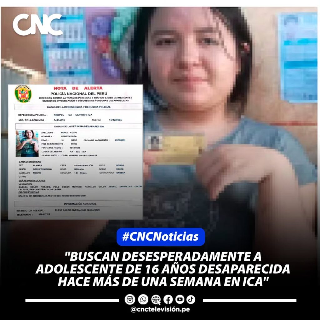 La provincia de Ica se encuentra en alerta tras la desaparición de Lisbeth Daita Pérez Coari, una menor de 16 años de quien no se tiene noticias desde el pasado 16 de diciembre. Según los reportes oficiales, la adolescente fue vista por última vez al salir de su domicilio ubicado en las inmediaciones de la Plaza José Olaya. Sus familiares, sumidos en la angustia, han hecho un llamado público a las autoridades y a la ciudadanía para intensificar las labores de búsqueda, ya que ha transcurrido más de una semana sin rastros de su paradero.