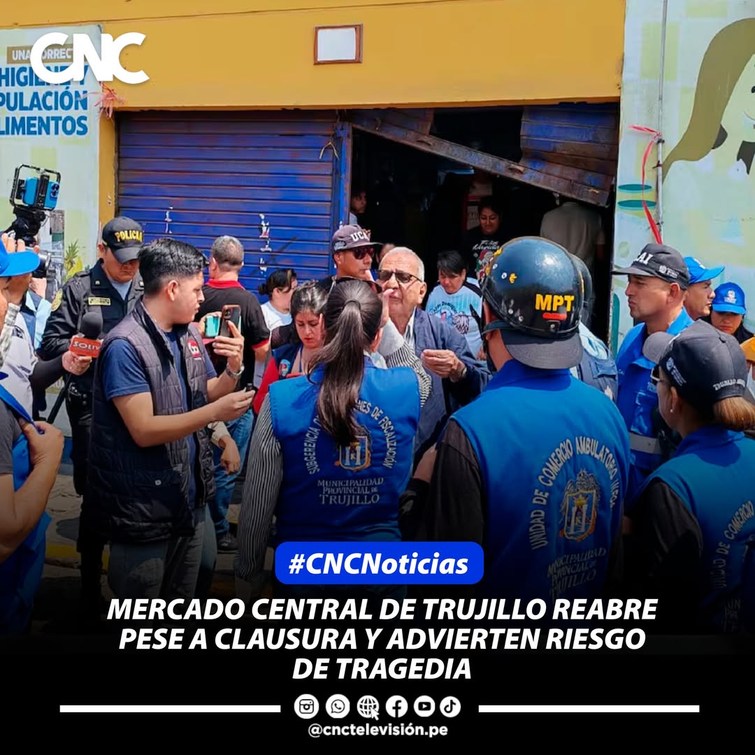 #noticias || #Trujillo || El Mercado Central de Trujillo volvió a abrir sus puertas pese a estar clausurado por la municipalidad provincial debido al riesgo de colapso de su techo, situación que las autoridades califican como una grave amenaza para comerciantes y clientes. Ante esta desobediencia, personal de la Subgerencia de Operaciones de Fiscalización intentó ayer soldar las puertas del establecimiento, en cumplimiento de la sanción vigente.